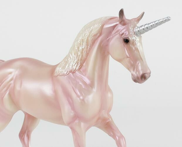 • Her pearlescent pink coat is kissed by the sun's morning glow, and her flowing mane and tail sparkle in the sunlight!