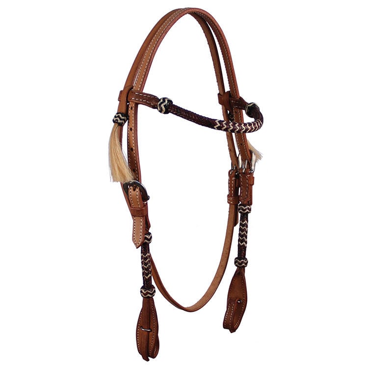- 2-Ply leather headstall with rounded tan rawhide brow and cheeks