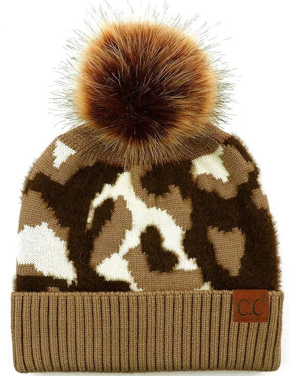 C.C. Baby Women's Fur Pom winter Cable Knit Beanie in Camouflage Taupe
