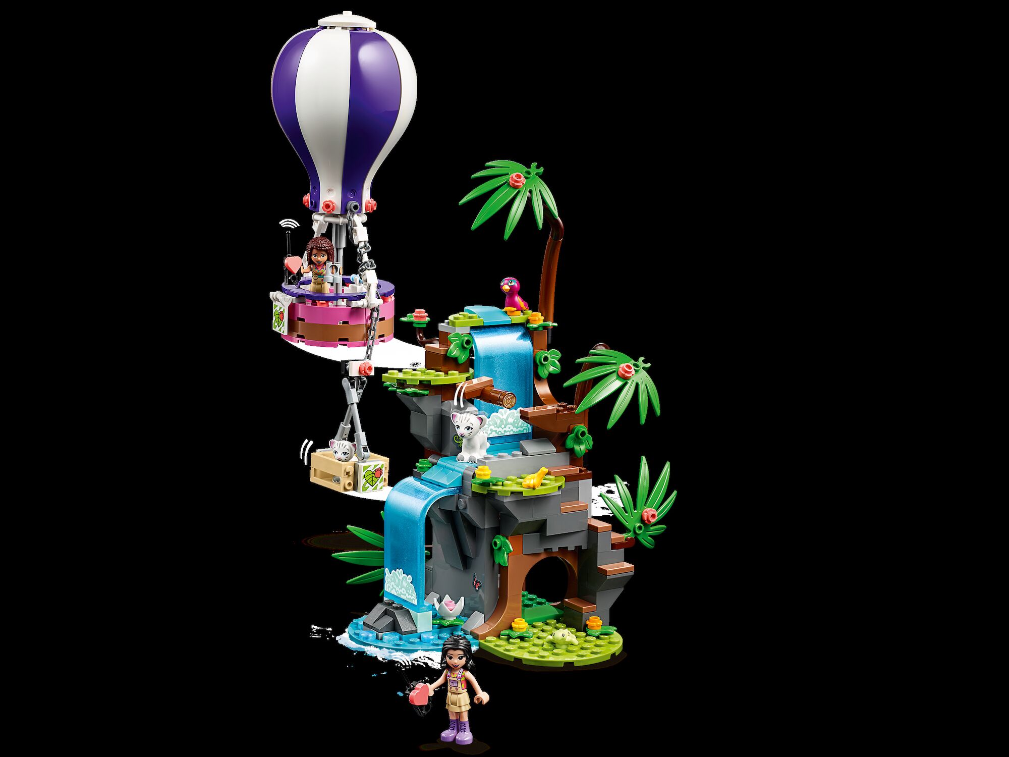 - Kids can invent exciting jungle stories with the help of a brick-built, hot air balloon toy, LEGO® Friends Emma and Andrea buildable mini-doll figures, 2 baby tiger toys, plus a number of other cute animal figures