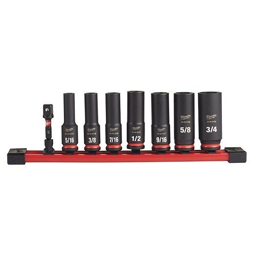 - Kit includes 7 Deep SAE Sockets and 1 Socket Adapter. The following sizes are included: 5/16, 3/8, 7/16, 1/2, 9/16, 5/8, 3/4, 3/8" Socket Adapter