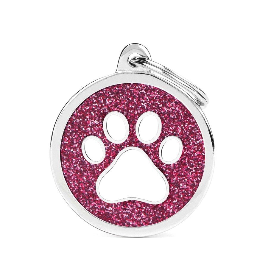 MyFamily Shine Big Pink Glitter Circle White Paw ID Tag