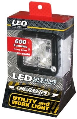 • Retail pack: Square LED work light, flood beam, black housing, 12-24V, color window box
