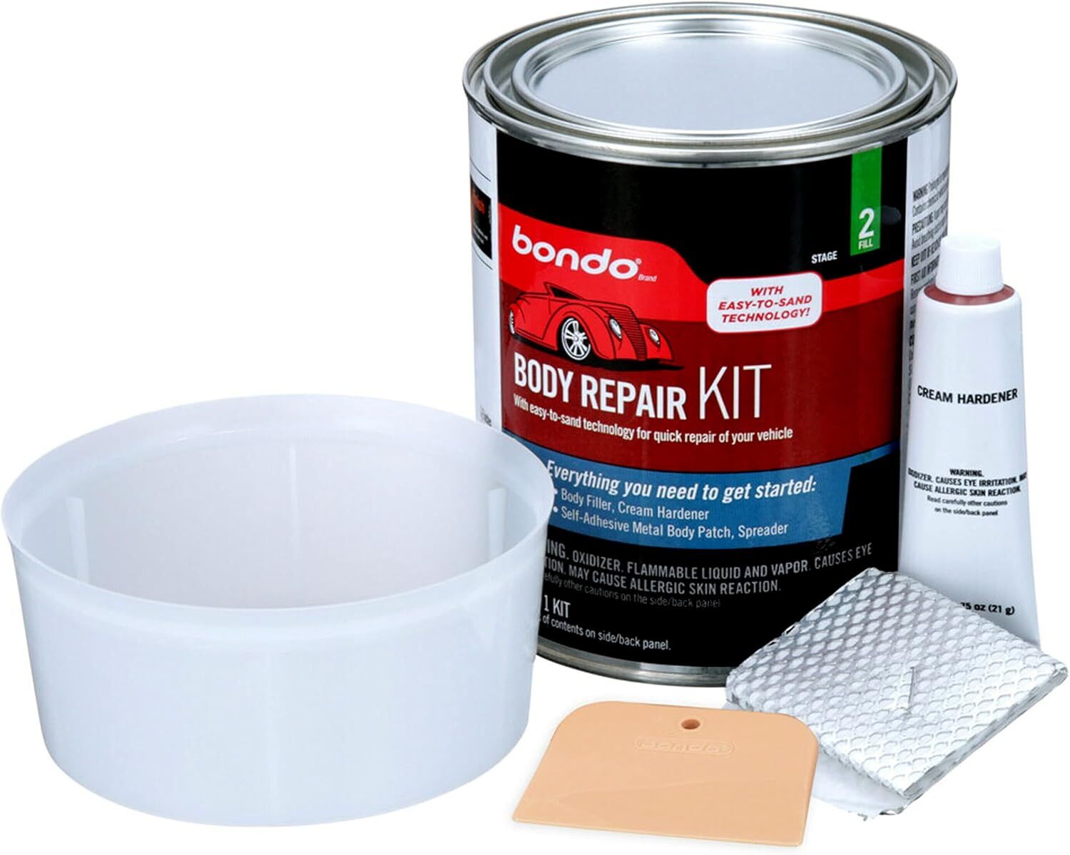 - Includes cream Hardener, a self-adhesive metal body patch, a spreader, and the original Bondo Body Filler