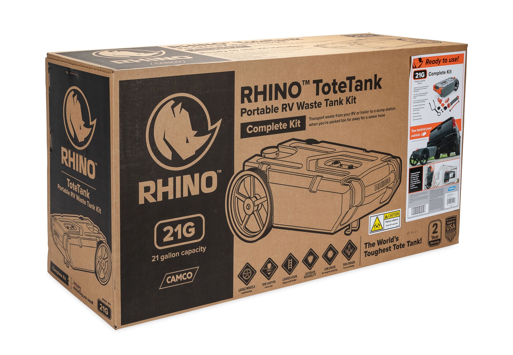 - Includes: (1) 21 gallon tote tank, (1) large, durable handle, (2) oversized wheels, (1) tank rinser, (1) ladder hook, (1) 3-foot, super heavy-duty sewer hose with swivel bayonet and lug fittings, (1) 15-inch female to female orange Rhino grey water hose, (1) clear elbow with a 4-in-1 adapter, (1) clear double bayonet elbow, (3) storage caps, (2) caps with lanyards for rinse connections and (1) steel tow adapter
