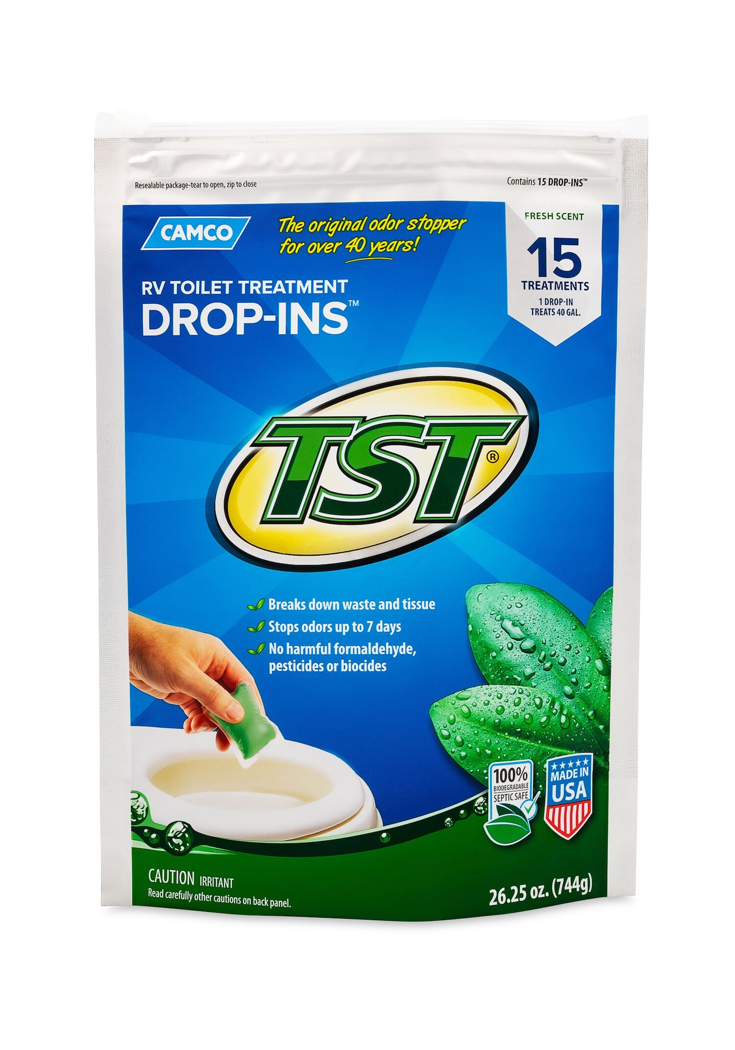 - Waste Holding Tank Treatment; TST (TM); Chemical Treatment Used To Break Down Waste and Tissue; Without Formaldehyde; With Deodorant; Original Scent; Treats 40 Gallon Holding Tank; Drop-INS ™ Individual Dose Pouches; Bag of 15 Treatments; With English/ French Language Packaging