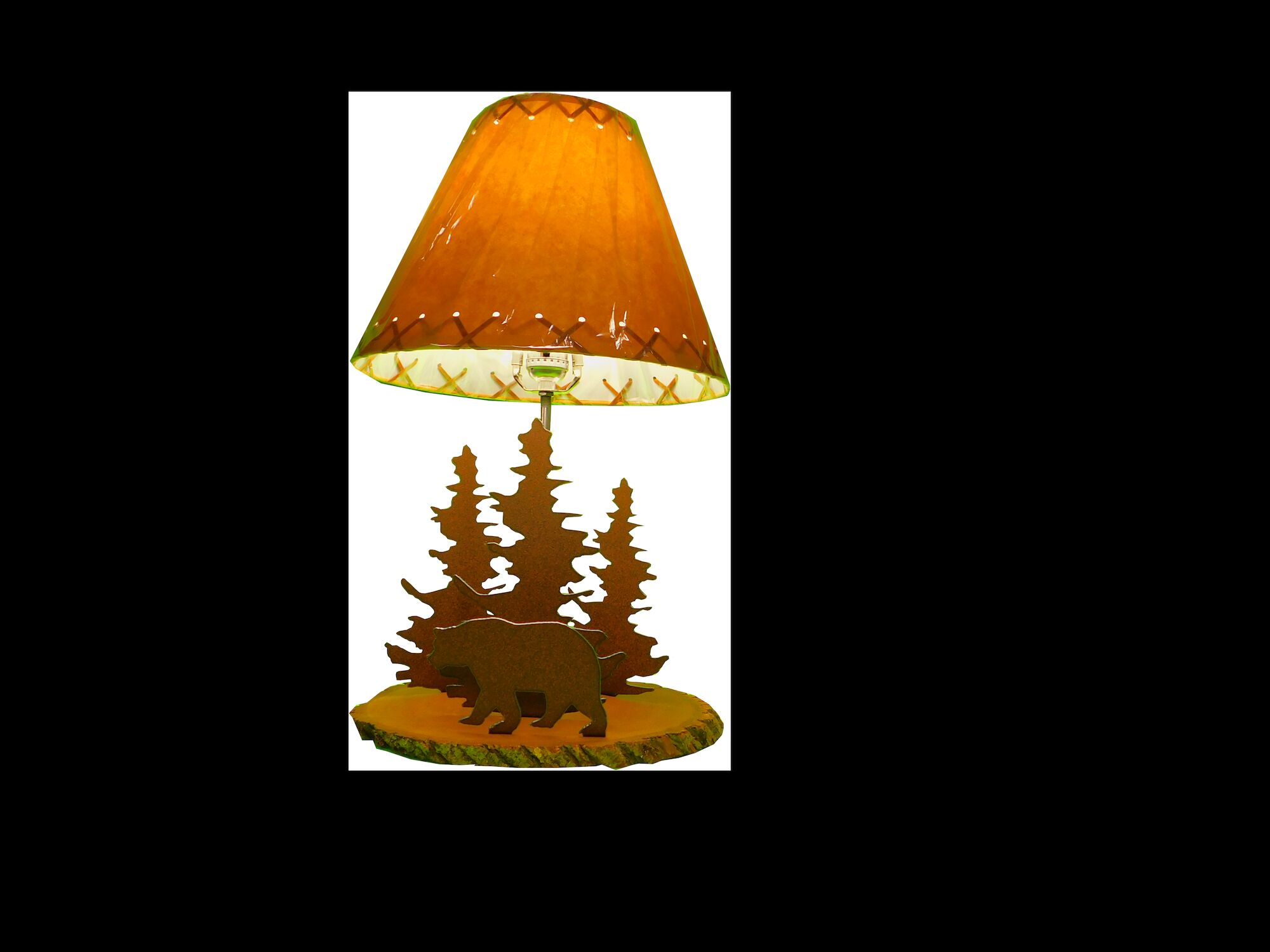 - Lodge Bear Lamp Metal is 18 gauge powder-coated steel, wood base, and a rustic laced shade