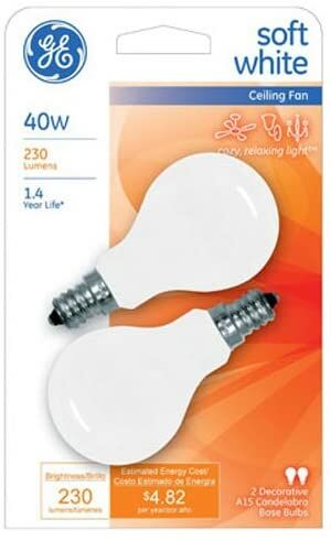 GE Ceiling Fan Light Bulbs (40 Watt), 230 Lumen, Candelabra Light Bulb Base, White, 2-Pack