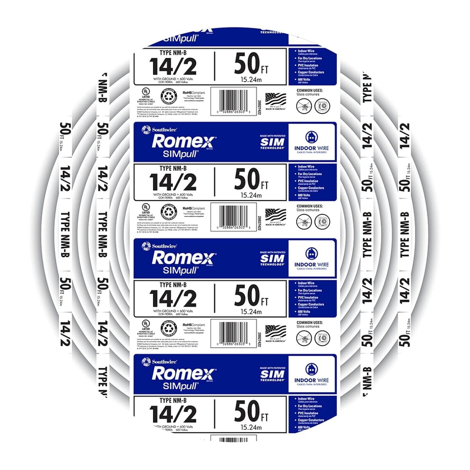 Southwire Romex SIMpull White NM-B Copper Cable 14 Gauge 2 Conductor Solid With Ground, 50-Ft