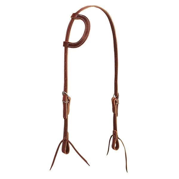 - This single-ply 5/8" brown latigo leather sliding ear headstall features double cheek adjustments and brown latigo leather lace water tie bit ends