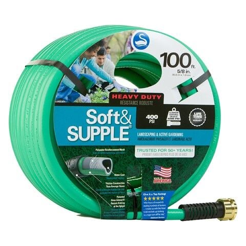 - Heavy-duty garden hose with a soft, flexible outer jacket