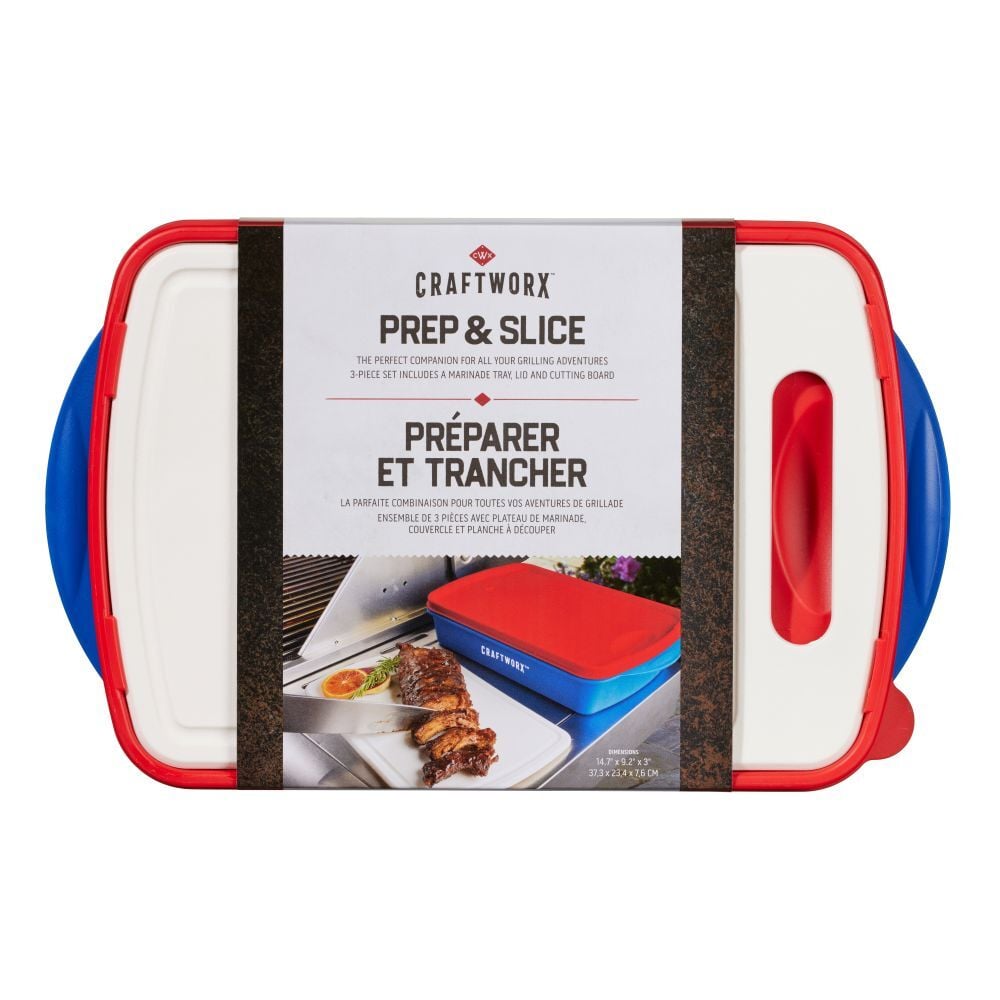 - 3 Piece set includes a marinade tray, lid and cutting board.