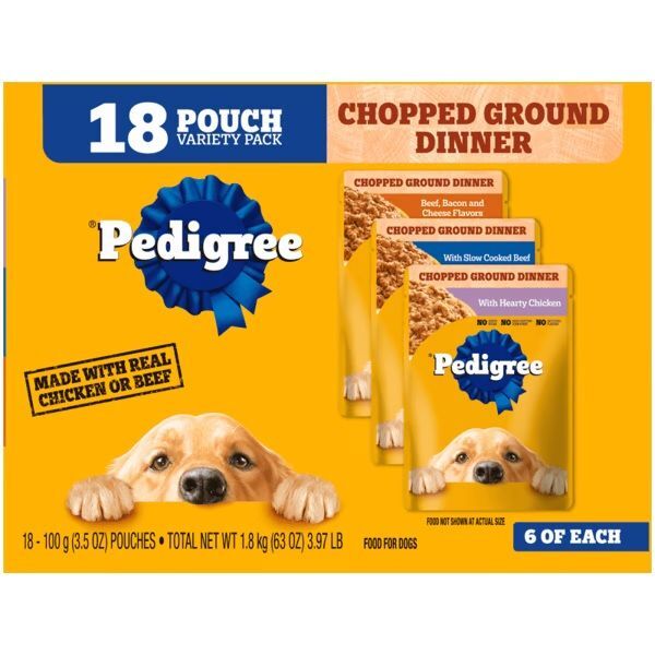 Pedigree Pouch Chopped Ground Dinner Variety Pack with Beef, Bacon, and Cheese Flavor, 18-Ct, 3.5-Oz