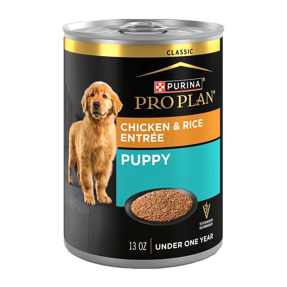 - Chicken and rice canned dog food for puppies helps support a healthy immune system and nourishes his healthy skin and coat