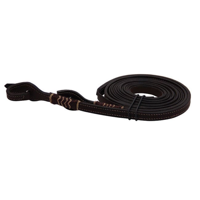 - 8-Foot leather split reins with brown rawhide accents and natural rawhide weave and easy change bit connector