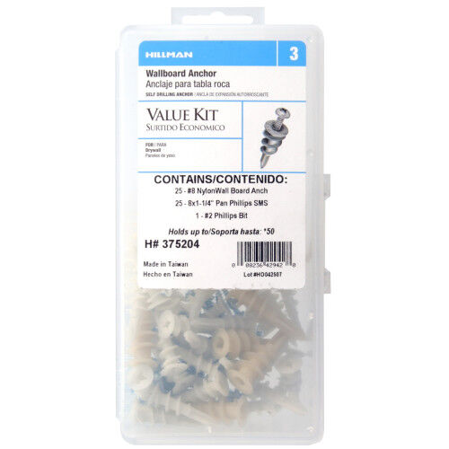 Hillman Nylon Self Drilling Drywall Anchor Kit With Screw, #8, 15-Pk
