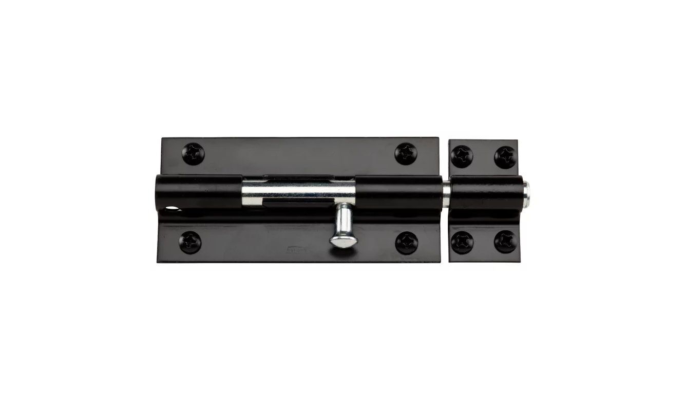- National Hardware's 8" Black Finish Extra Heavy Barrel Bolt is designed for security on farm buildings, sheds, stockrooms, doors and other heavy-duty installations; it can be padlocked for additional protection