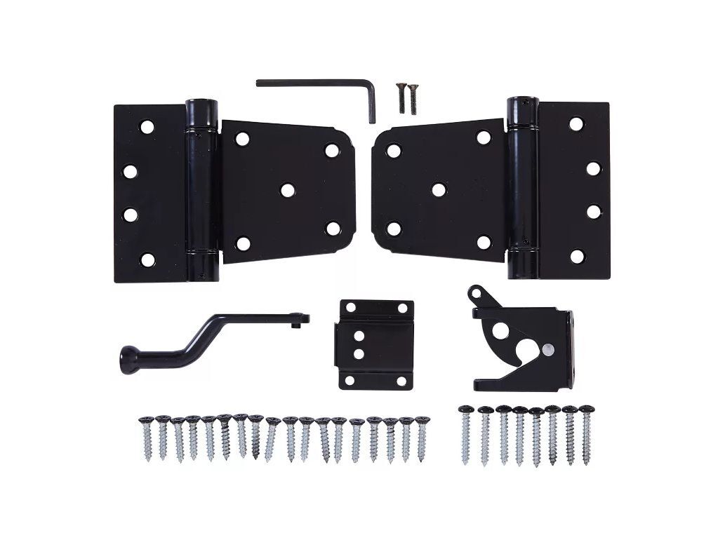 - Kit includes:1 - Gate latch, 2 - Gate hinges, Mounting fasteners, and tool for adjusting spring hinge tension.