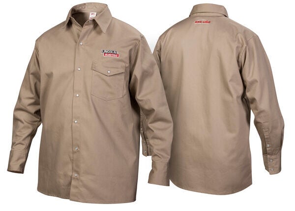 - Add breathable light weight protection with a 9 oz. 100% flame retardant material khaki welding shirt