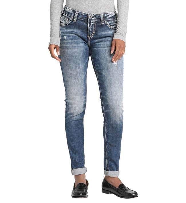 - Mid stretch denim offers a comfortable fit that doesn't cling to the body