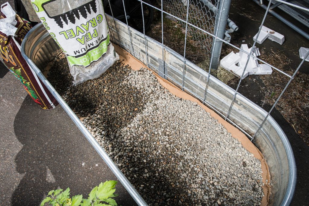 Sunlight is essential, but if your stock tank is metal rather than plastic, it can heat up in the sun. Once you find a good location, mark a 2-inch perimeter around the entire stock tank. Then, dig 3-inches down and add enough crushed rock to fill the hole. This will give your stock tank planter plenty of drainage.
