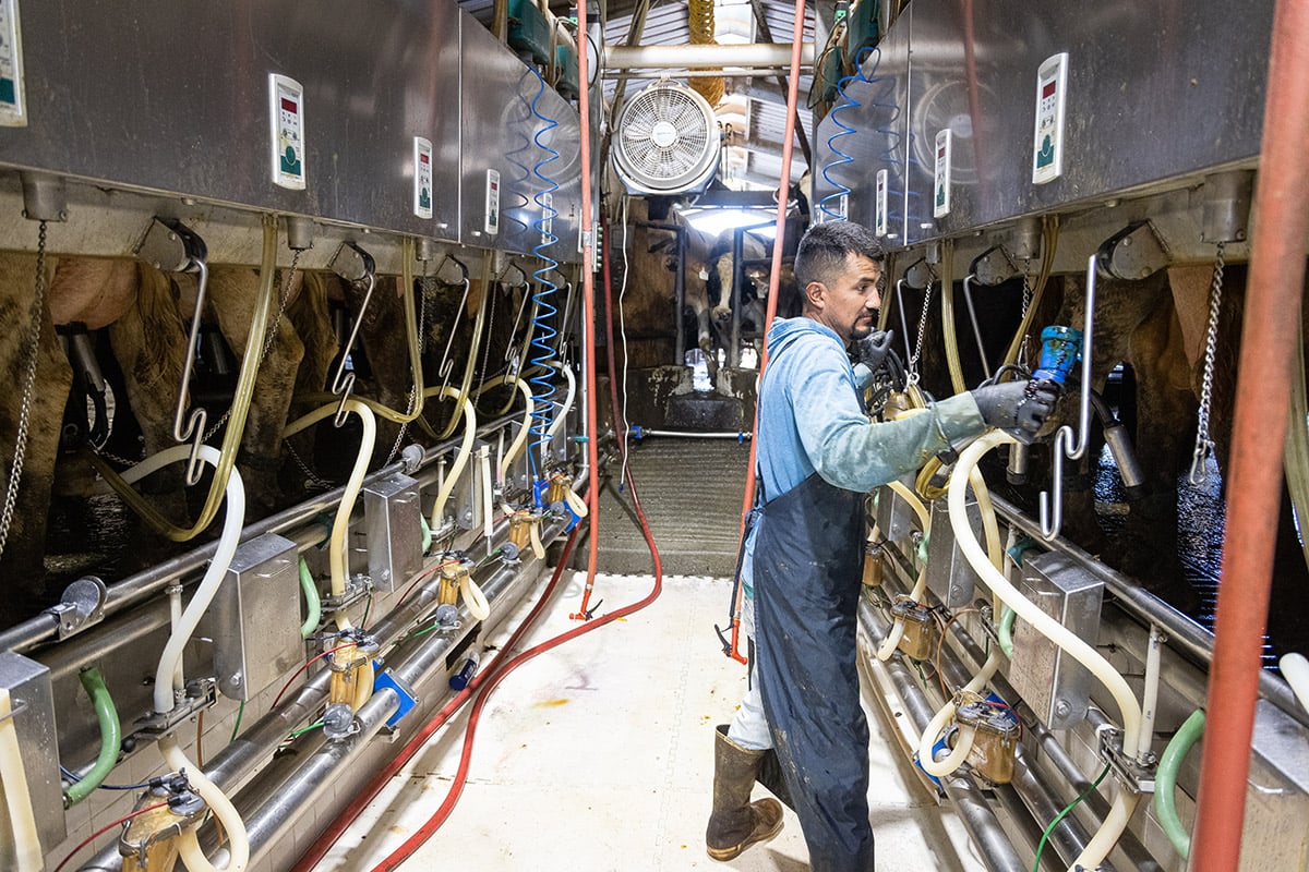 “We run what they call a double-18 parlor with two milkers,” Larry explained. “On any shift, we’ll have a couple of mechanics, as well as two people milking 18 cows at a time. We also have folks feeding calves and the cows that are pregnant or have recently given birth. The others are busy with pastures, irrigation, harvesting, herd health, and moving cows.”
