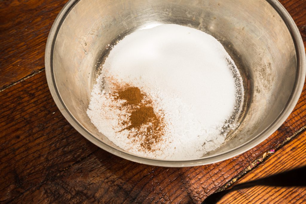 In a large, clean bowl, combine sugar, Clear-jel, and cinnamon. Add nutmeg if desired.
