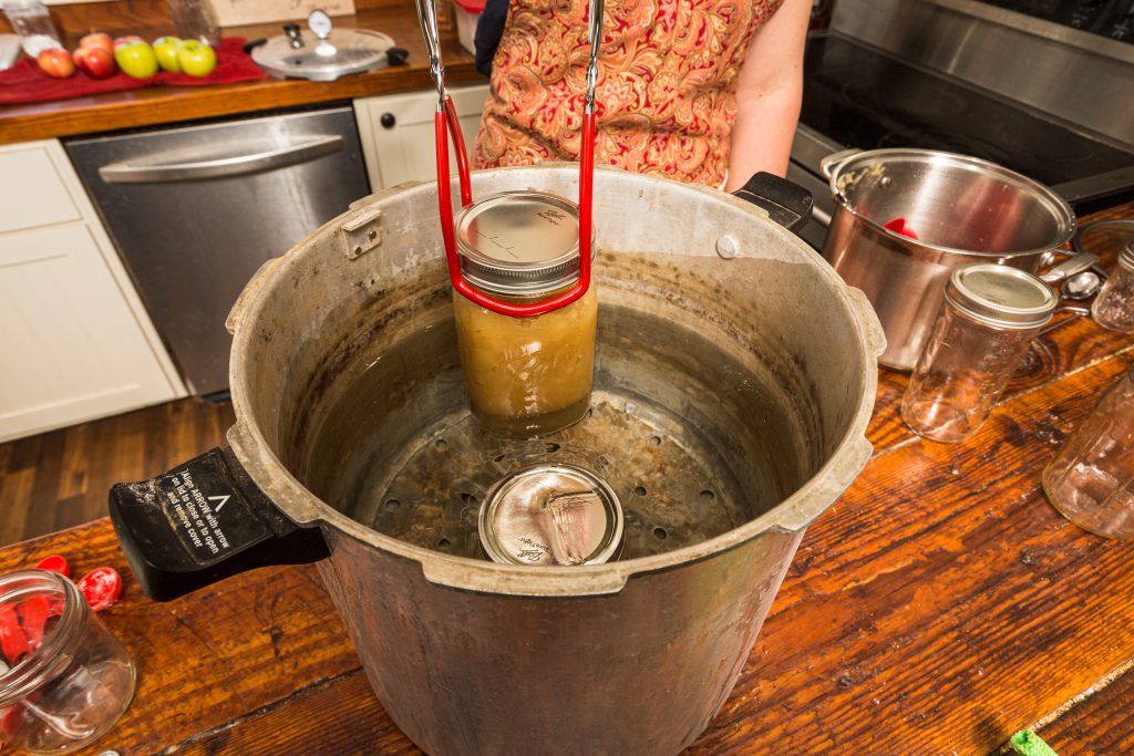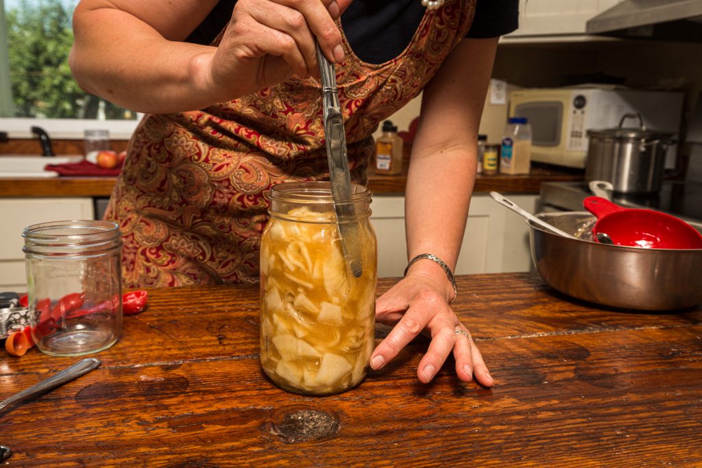Use a knife on the inside of each jar to remove excess air. This helps prevent the apples from browning.
