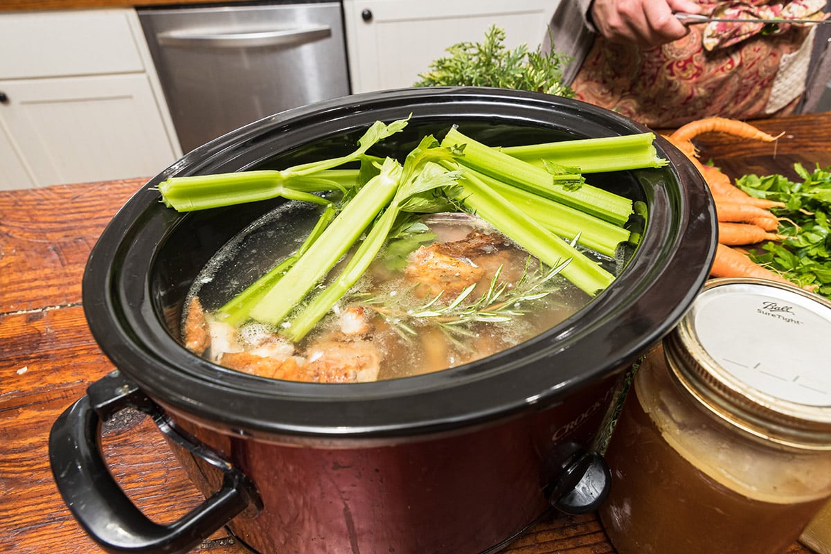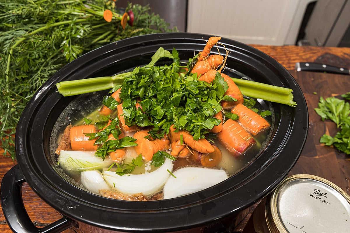 Time to cook: Cover and simmer on low for 24-48 hours: In the end, you’ll have a wonderful broth that you can simply strain and pour into your clean jars. Be sure to leave 1-inch of headspace, tighten the lids, and freeze them for later.