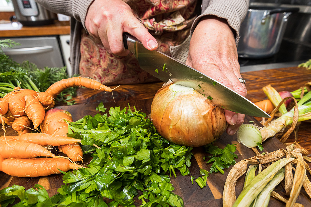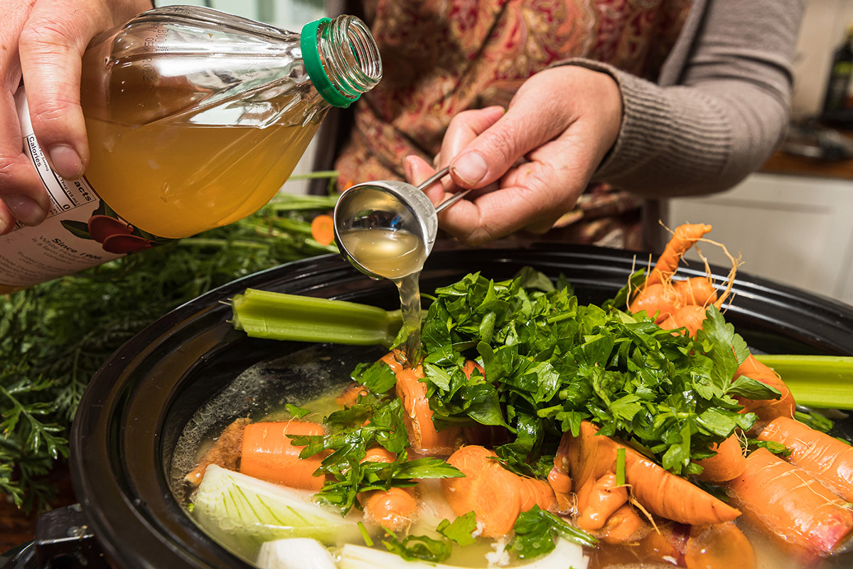 Give it some flavor: Now add your veggies. Onions, carrots, parsley, and celery are all good choices when creating a chicken broth. You can also add thyme, rosemary, or just about anything else growing in the garden.