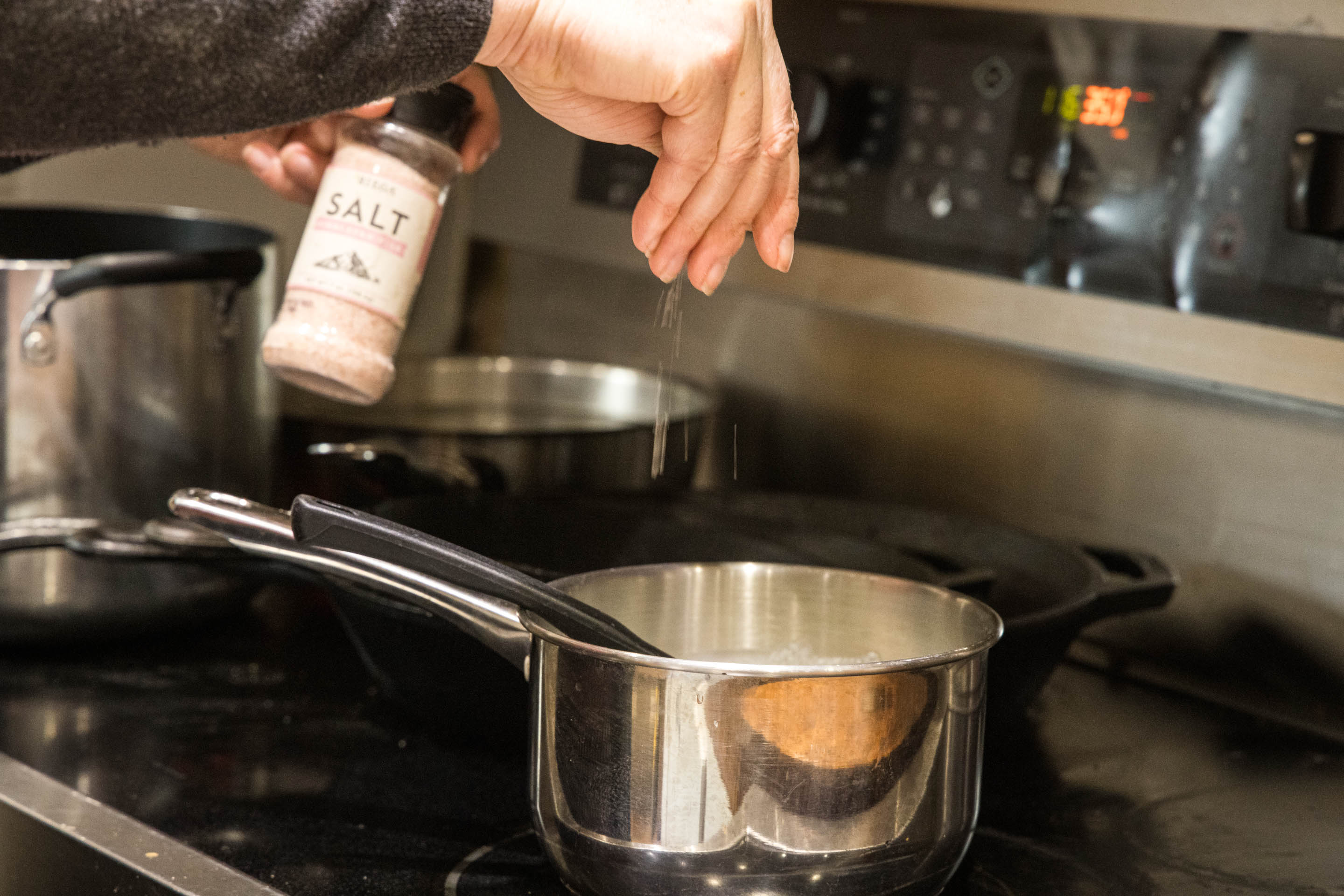 In a medium saucepan, combine 2 cups of cream, 2/3 cups granulated sugar and the salt. Now, remove the seeds from your vanilla bean and add those to the saucepan.