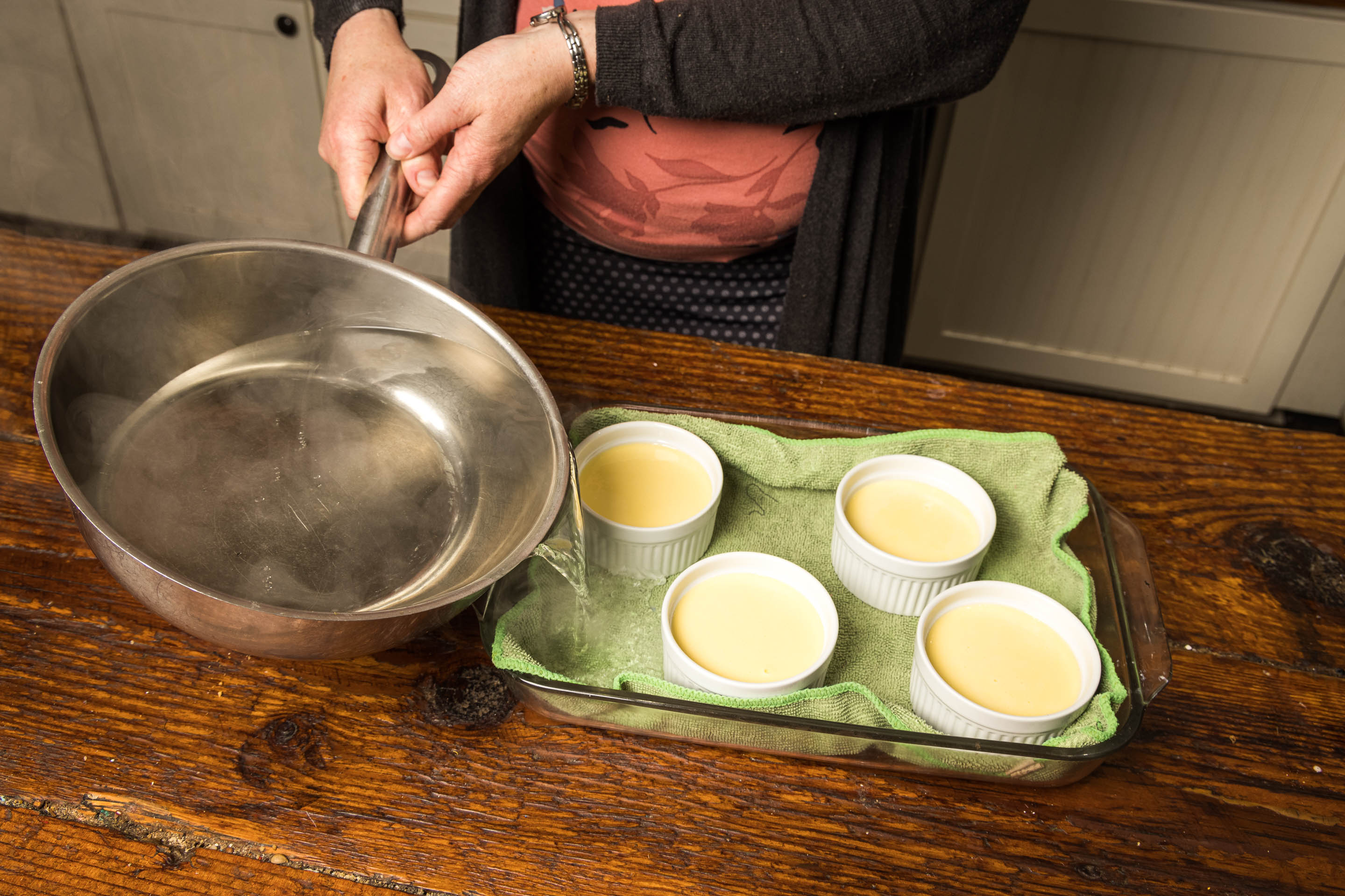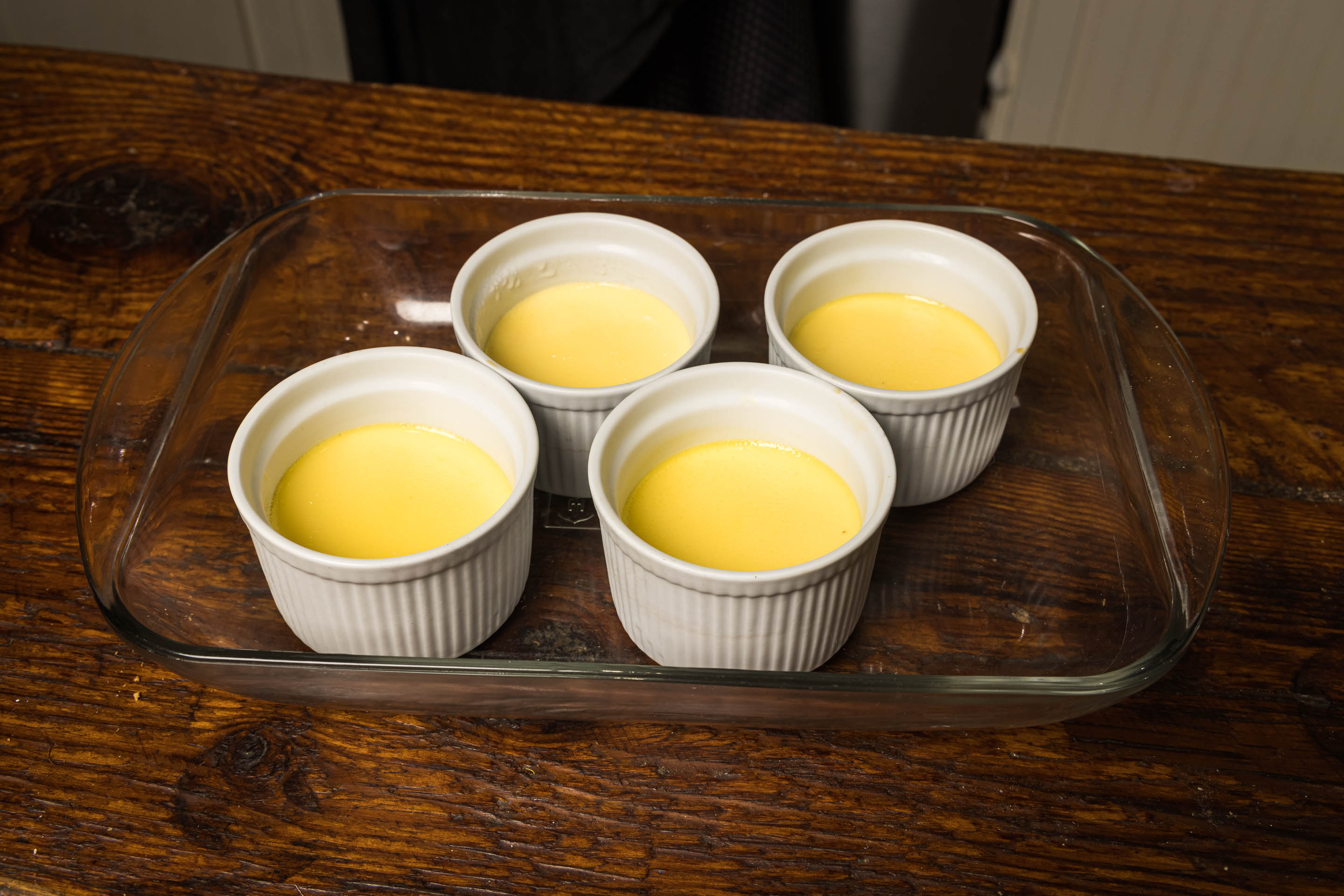Pour that custard evenly into your ramekins.Carefully pour boiling water into the pan until you reach 2/3 of the way up the side of the ramekins.