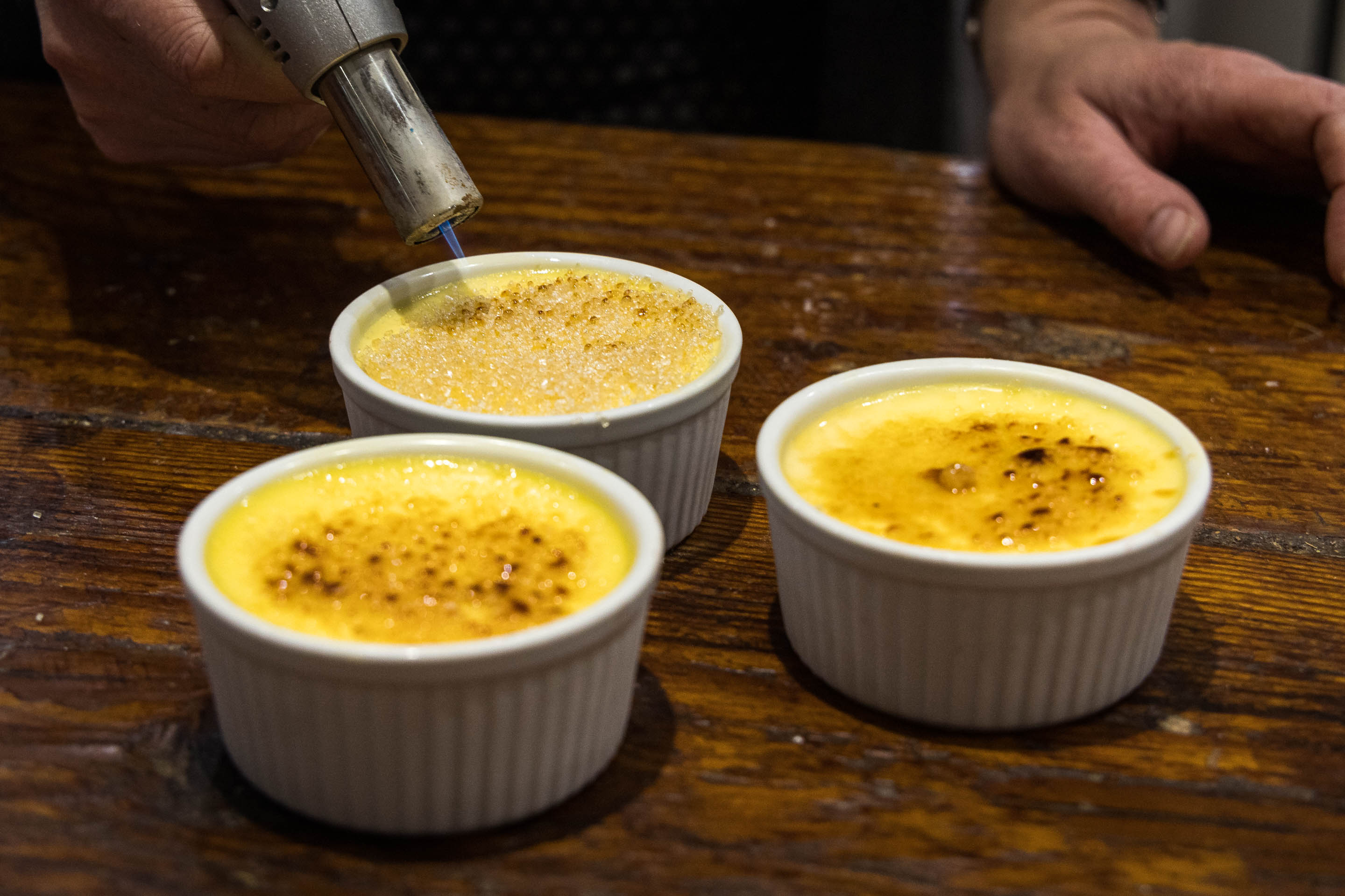 When you’re ready to serve, take out of the fridge, blot the moisture from the top, and sprinkle each with turbinado sugar.Using a torch, caramelize the sugar on the top of each dessert.