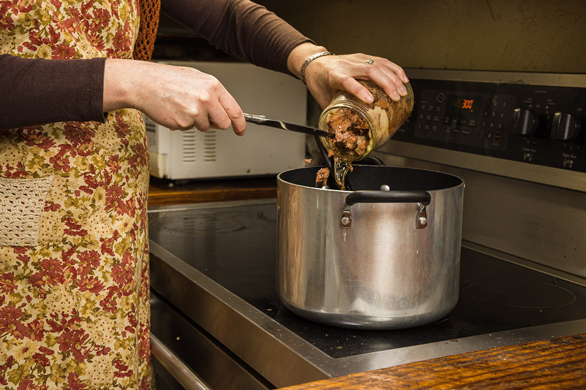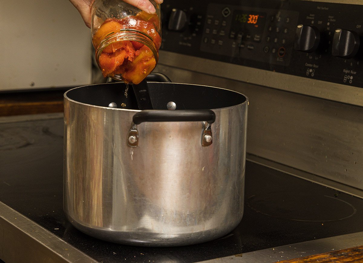 Greta then added 2-quart jars of her canned tomatoes as a base and added water.
