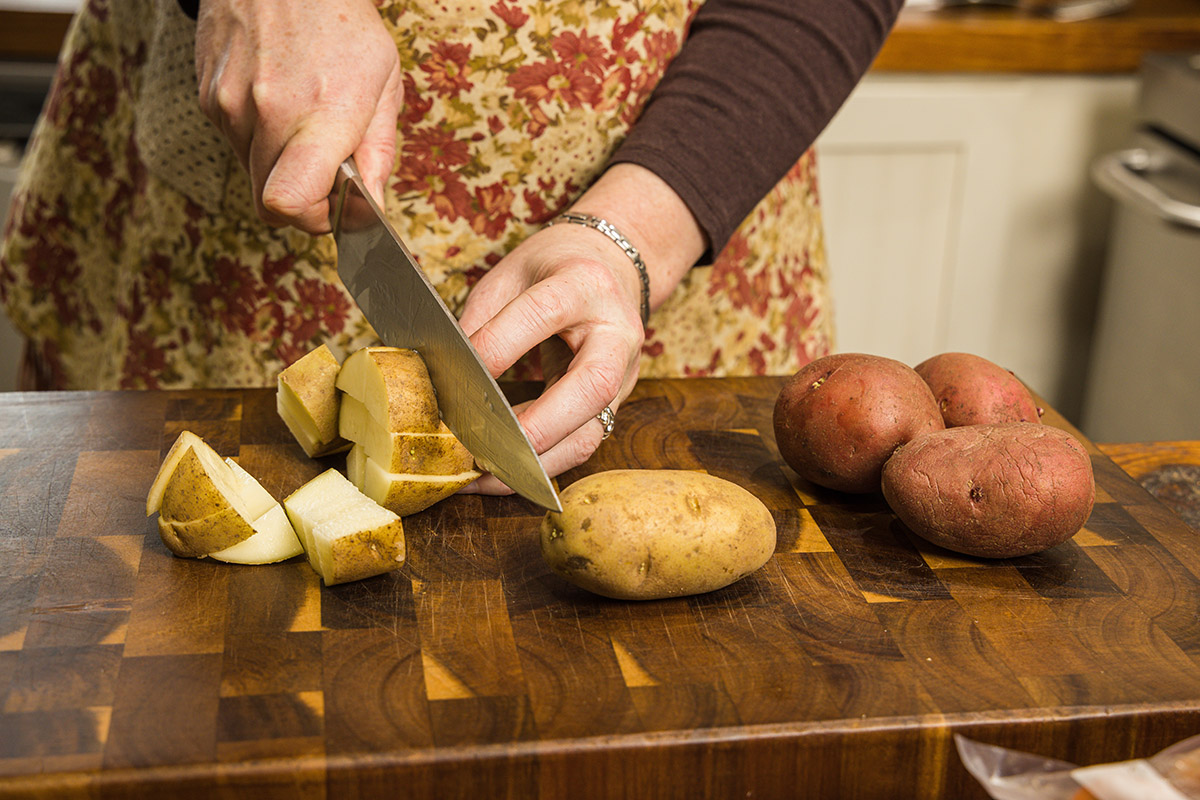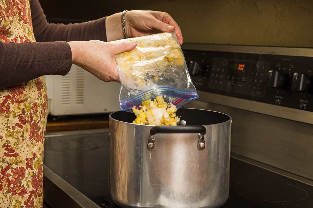 Then, she added her diced potatoes and vegetables. Each of the veggies, that they grew last year, were in quart bags from the freezer.