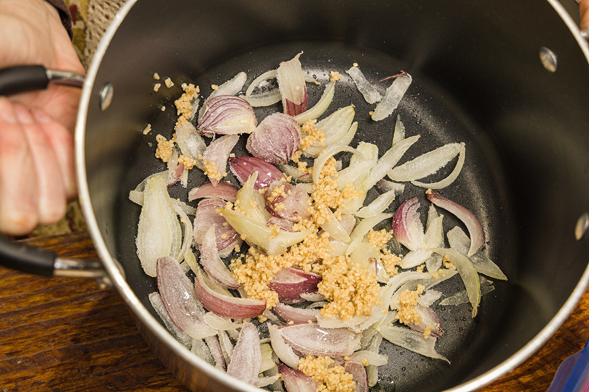Using an eight-quart stockpot, chop and sauté an onion & Garlic until it is translucent.