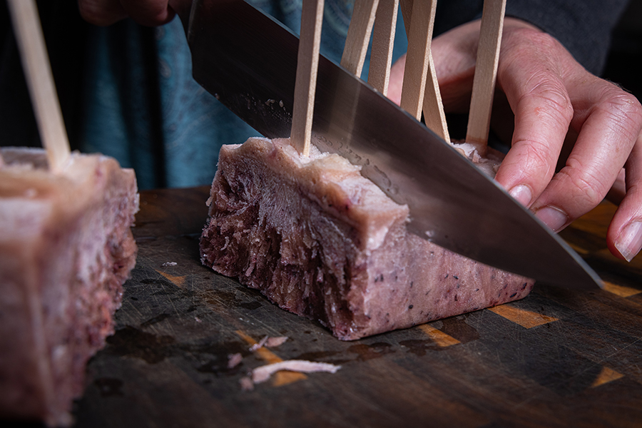 Pull the whole frozen wonder out of the bread pan and cut along the popsicle sticks.