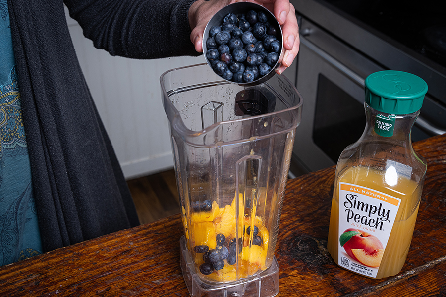 Cut up and add your chosen fruit to a blender. Greta used 2 cups of peaches and 2 cups of blueberries.