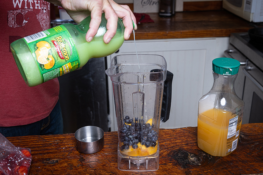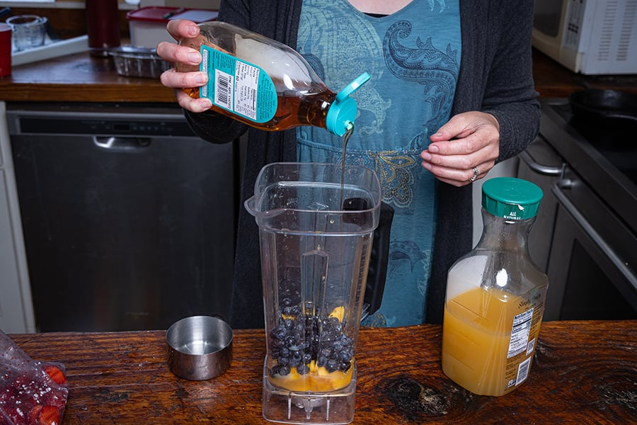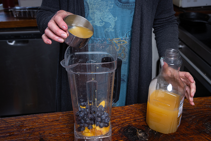 Now, add half a cup of your chosen juice. Greta added orange juice with the peaches and blueberries for a wonderful taste explosion.