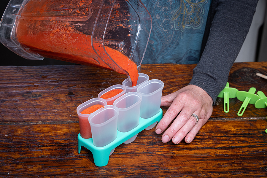 Pour the popsicle mixture into the molds. Don’t fill them all the way to the top.