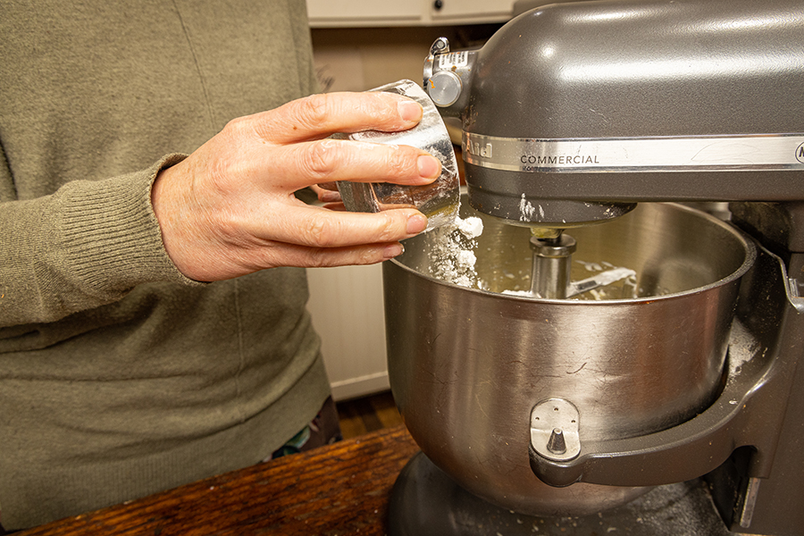 Add a small portion of the dry mixture to the wet ingredients in the mixer. Then add some of the yogurt. Turn on the mixer and alternate adding the dry and yogurt mixture until everything is in the mixer.