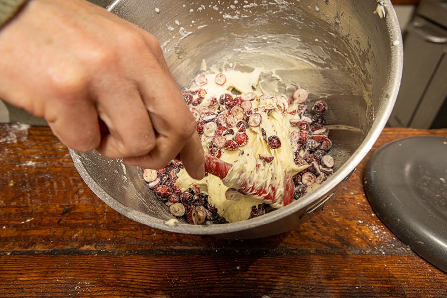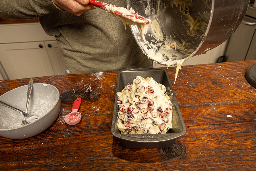 In another bowl, add 1 tablespoon of your dry mixture to the cranberry halves. Toss to coat. This will keep the cranberries from sinking to the bottom of the bread. There’s probably a scientific explanation for this, but we’ll just chalk it up to good old-fashioned, hand-me-down smarts.
