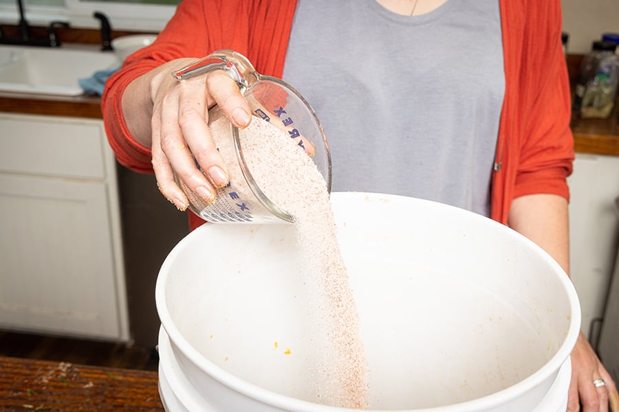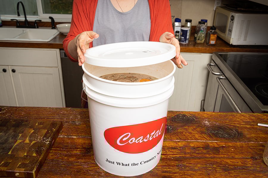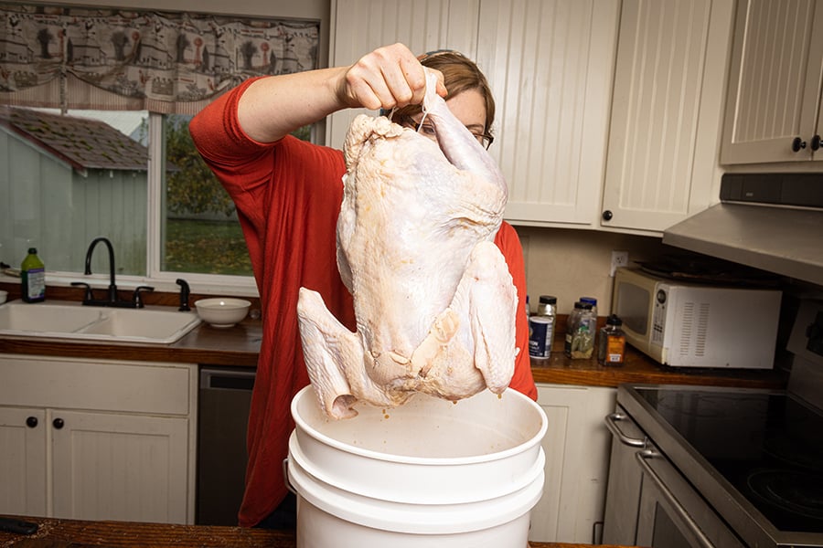 Slowly lower your turkey into the brine. Add cold water to the bucket until the turkey is submerged.