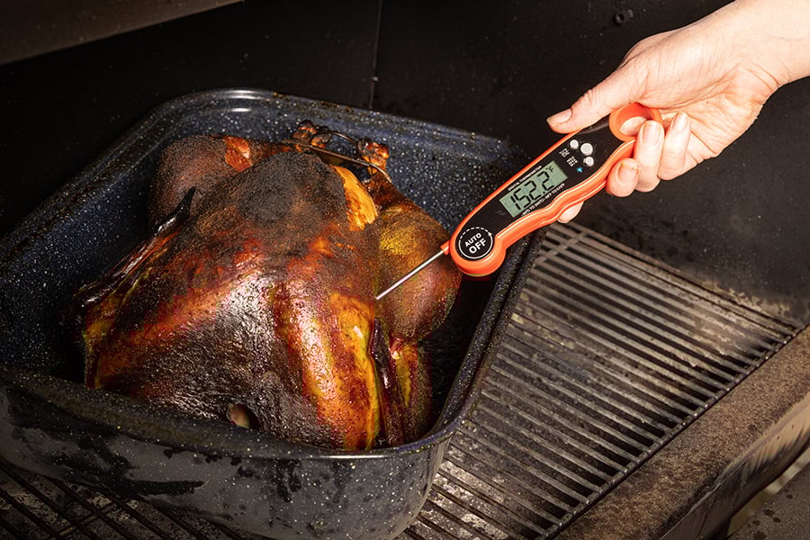 Check the internal temperature often. Pull the turkey off the grill once you reach 150º F. Even though it’s out of the grill, it should quickly reach a safe internal temperature of 165ºF.