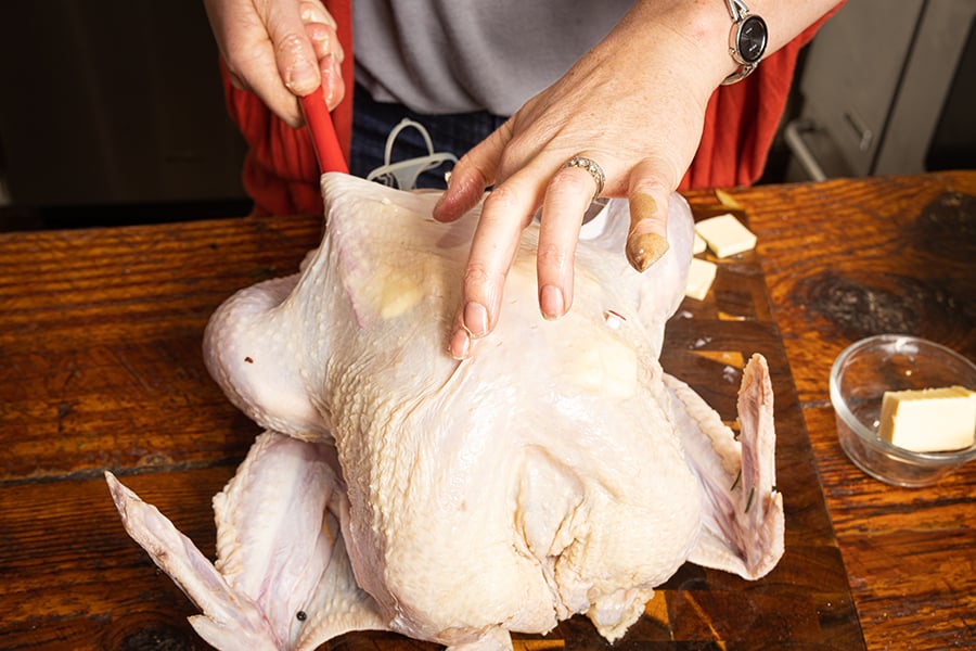 Using a spoon, push open the space between the meat and the skin. Then add small pats of butter all over the bird. Use the entire stick of butter.
