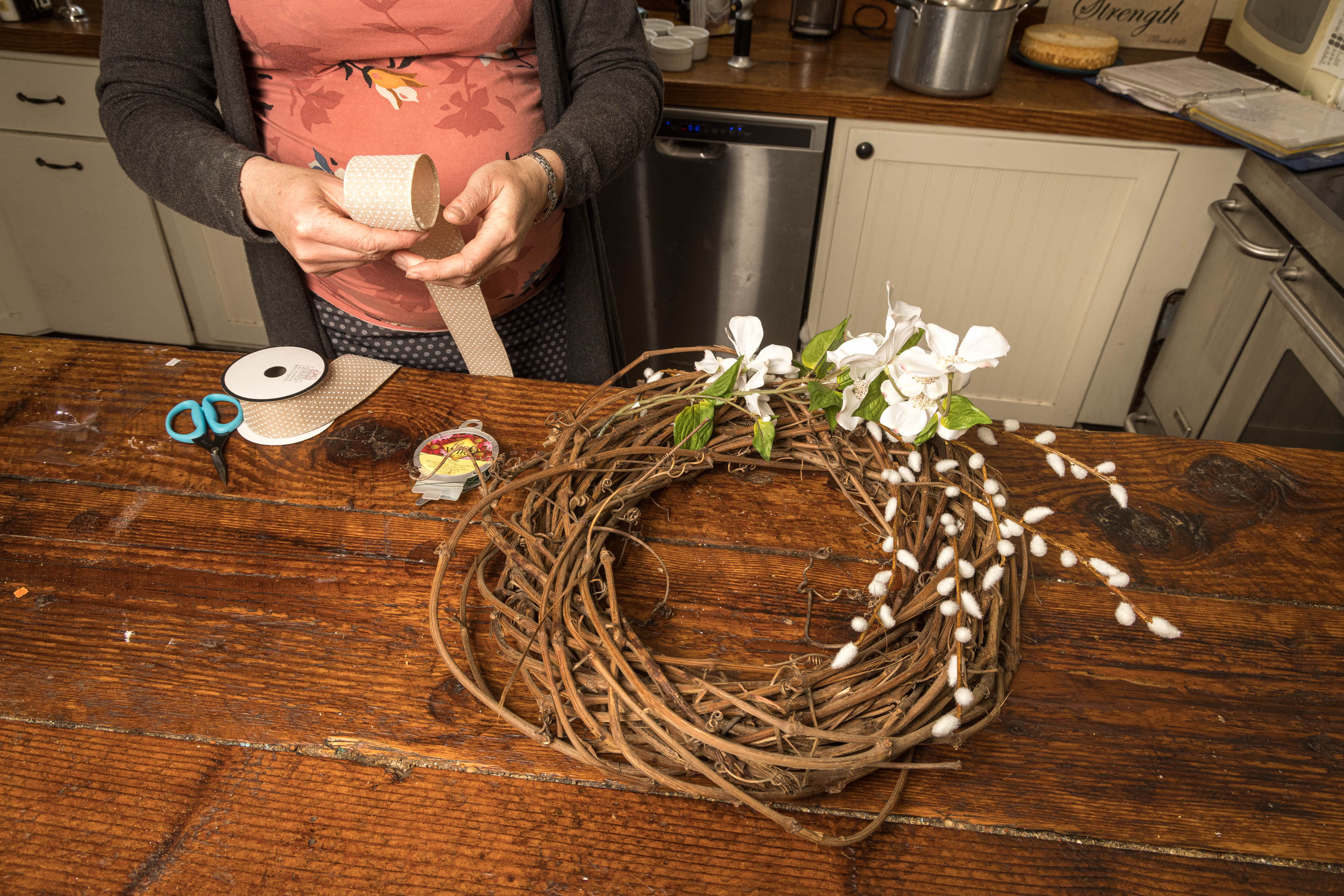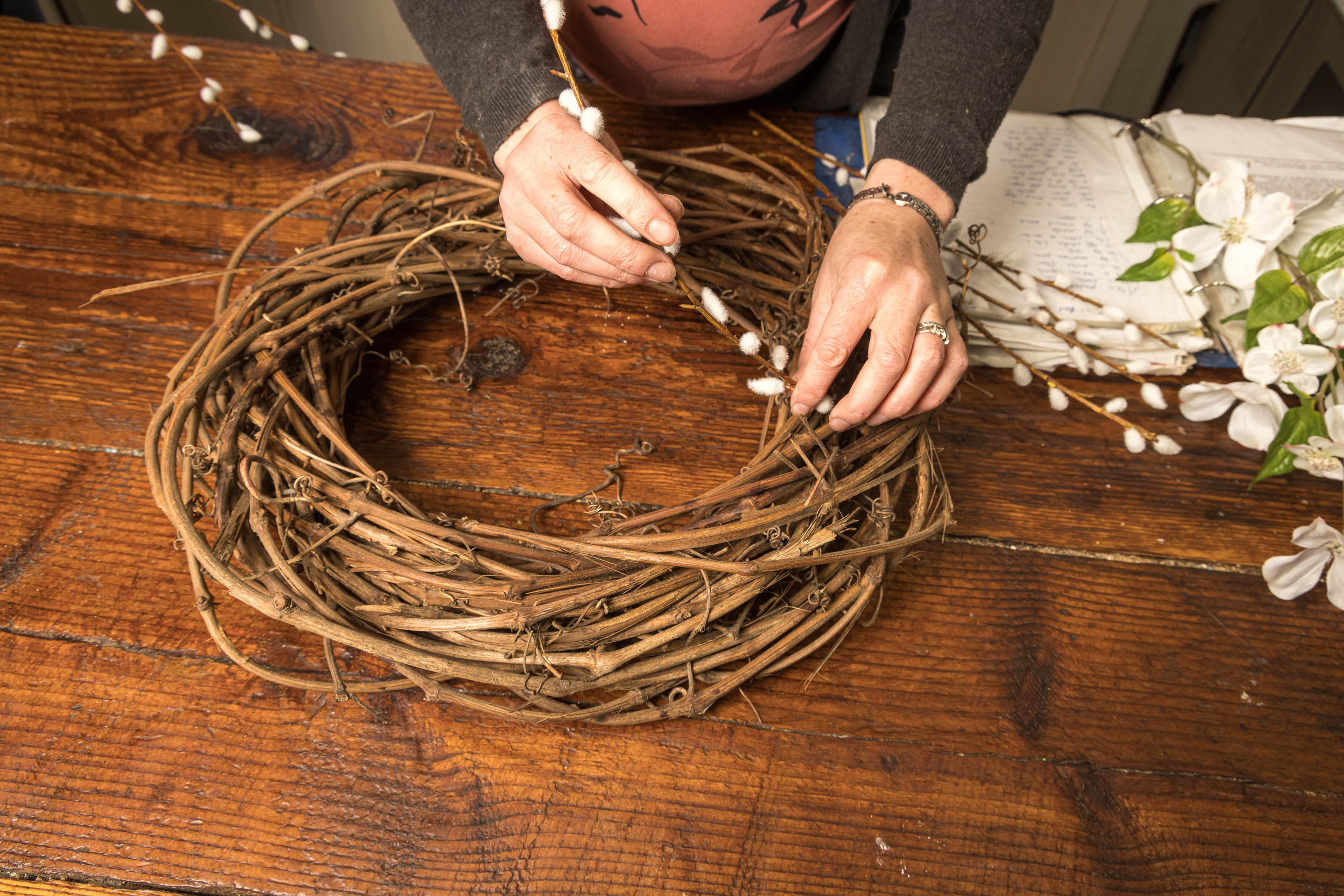 Once you’re happy with your wreath, it’s time to add your decorations. Greta is adding some imitation willows and flowers.