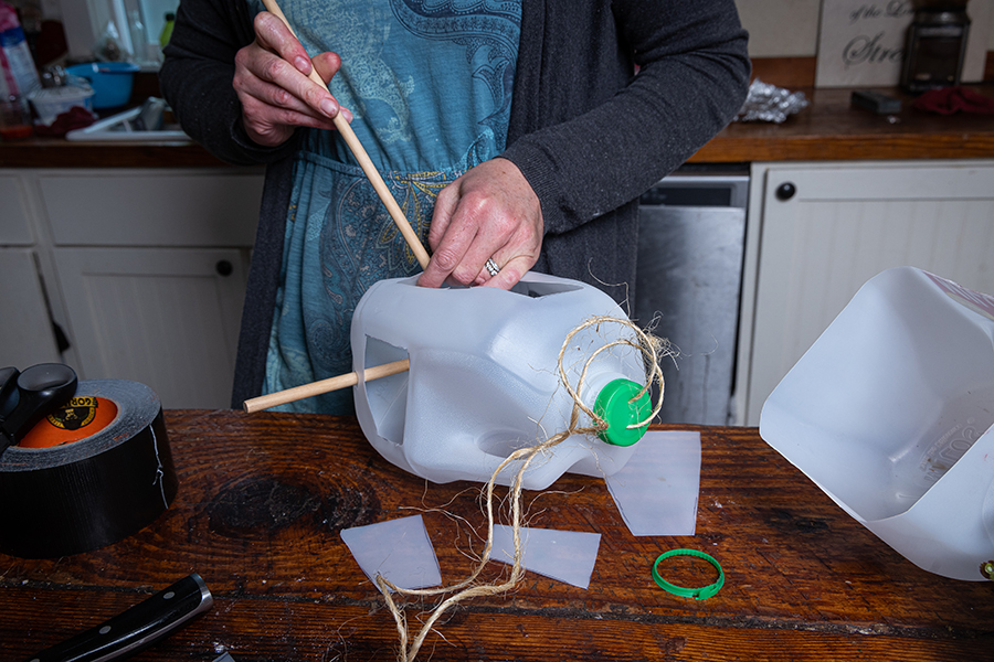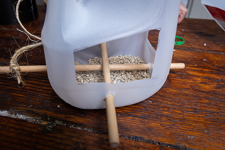 Next, cut an opening on all four sides of the jug. This is where birds will access the seed. The size of the opening will limit the size of birds that can visit your feeder. If you only want to attract smaller birds, keep your openings small. Finally, leave at least one to two inches of the bottom for the dowels and the seed.