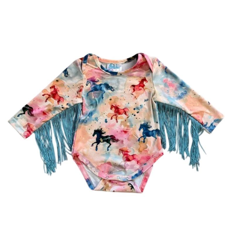 Shea Baby Kids' Watercolor Horse Long Sleeve Fringe Onesie